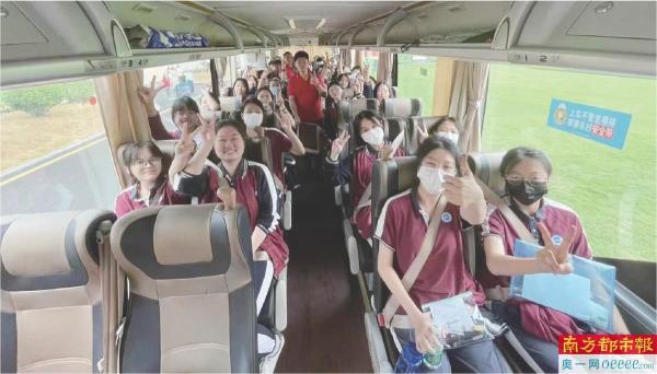 正在交警护送下,大亚湾区外语实验学校考生乘坐大巴前往大亚湾第一中学考点。