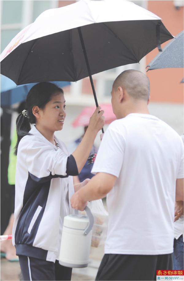 下午5时,高考数学科目检验完毕,惠州知止学校考点门口,学生家长撑着伞,等候考生出门,送餐加拥抱,是家长满满的爱。