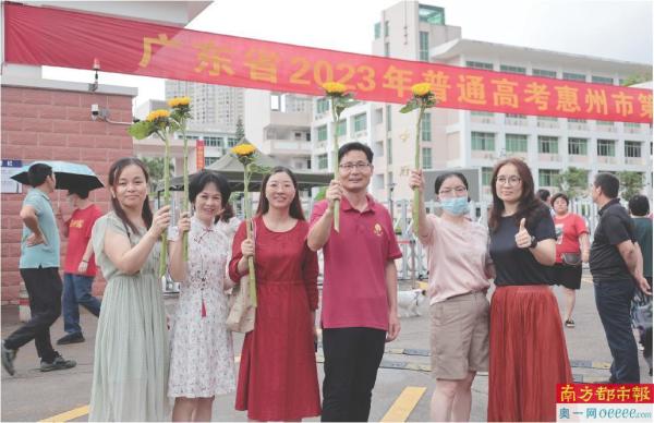 正在惠州一中考点外,送考教师们手举向日葵折映,也祝福考生们一举夺“魁”。