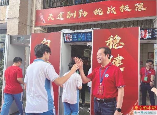 惠州市华罗庚中学考点,校长陈绍安和考生们击掌。